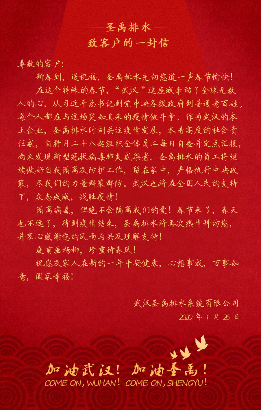 新春到,送祝福,圣禹排水先向您道一聲春節(jié)愉快!在這個特殊的春節(jié),“武漢”這座城牽動了全球無數(shù)人的心,從習(xí)近平總書記到黨中...